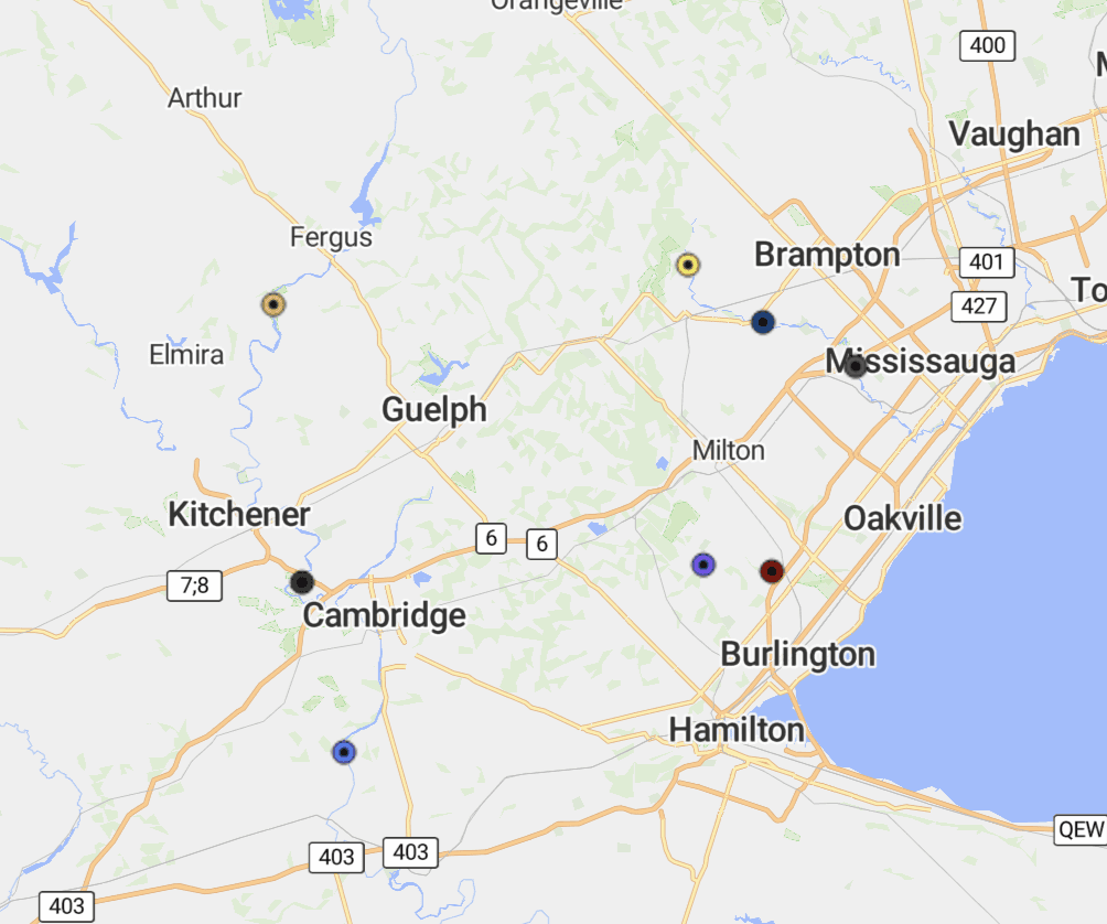 We have deployed our bottles at 8 different sites across 3 water systems (Grand River, Credit River, and Bronte Creek) including near Elora, Burlington, Mississaugua, and Georgetown in Ontario.